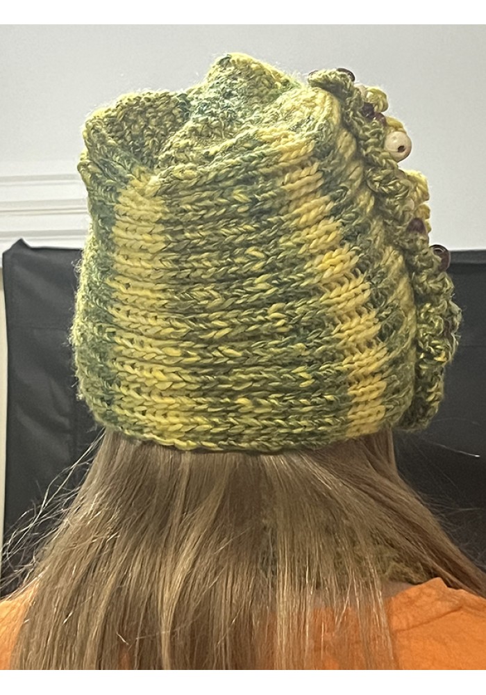 winter hat handmade with knitting needles decorated on the side with wooden beads