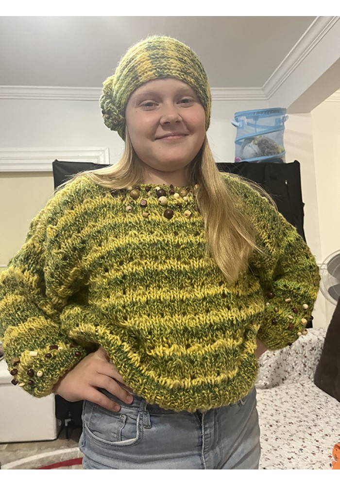 handmade with sleeves decorated with wooden beads made with knitting needles